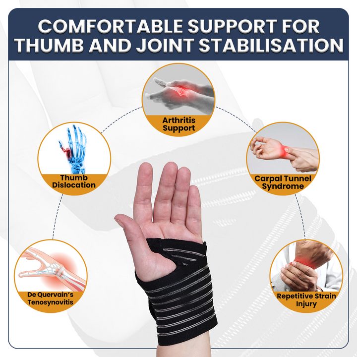 A supportive brace designed to stabilise the wrist and thumb, reducing pain from sprains, tendonitis, arthritis, or repetitive strain. Provides firm immobilisation while allowing comfortable hand movement for daily tasks and light activity.
